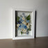 Květinový ručně vyrobený obraz s květy v bílých a modrých barvách, které rostou ze středu obrazu. Mezi květy najdete hortenzie, ostrožky a mnoho dalšího.