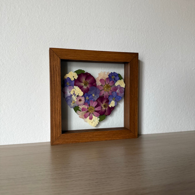 Květiny jsou zasazeny mezi skla a doplněny ručně vyráběným dřevěným rámem, který vzniká přímo v naší dílně. 🪵