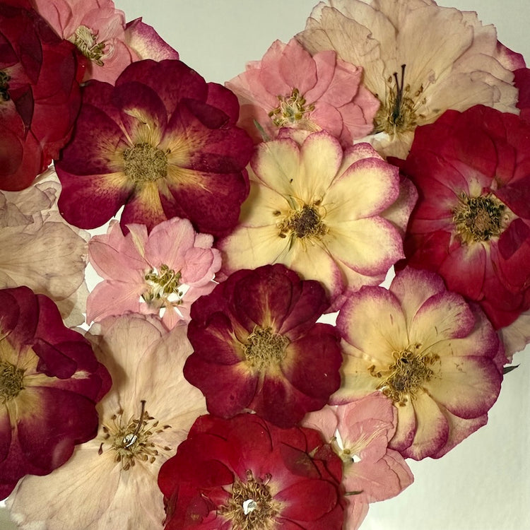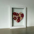 Květinový ručně vyrobený obraz s květy v růžových a červených barvách, které rostou ve tvaru srdce ze středu obrazu. Mezi květy najdete květy třešní, růže, ostrožky a mnoho dalšího.