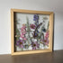 Květinový ručně vyrobený obraz s květy v růžových, bílých a modrých barvách, které rostou ze spodu obrazu jako louka. Mezi květy najdete krásenky, černuchy, ostrožky a mnoho dalšího.