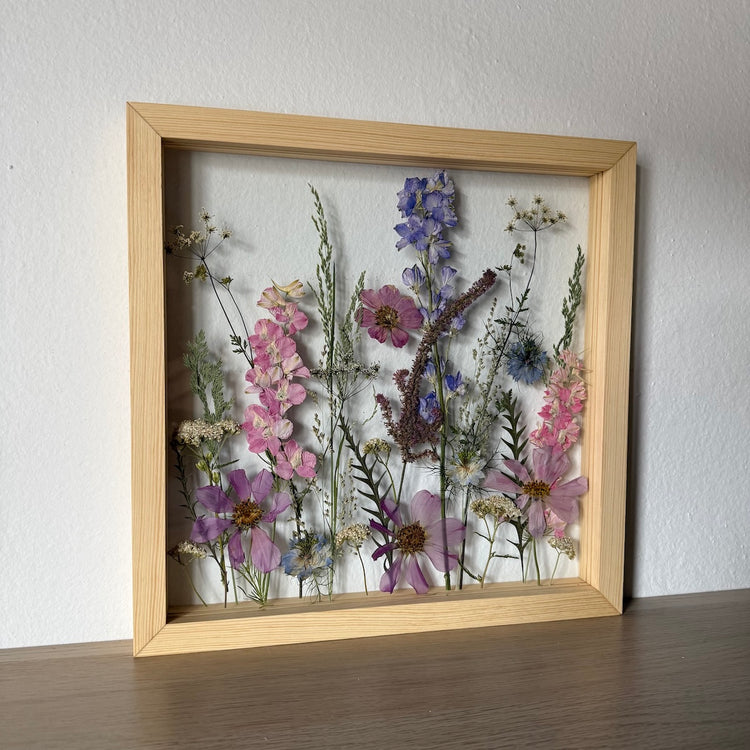 Květiny jsou zasazeny mezi skla a doplněny ručně vyráběným dřevěným rámem, který vzniká přímo v naší dílně. 🪵
