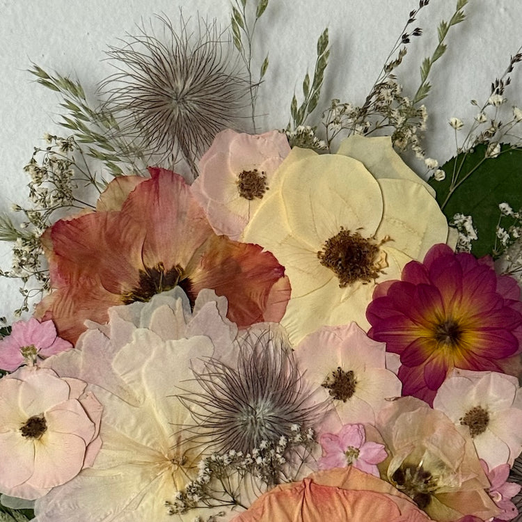 Použité květiny a rostliny jsou skutečné, ručně sbírané a šetrně lisované, aby si zachovaly svou přirozenou strukturu, jemnost i barevnost. 🌿 Následně jsou s citem aranžovány do jedinečné kompozice – každý obraz je originál, žádné dva kusy nejsou stejné.