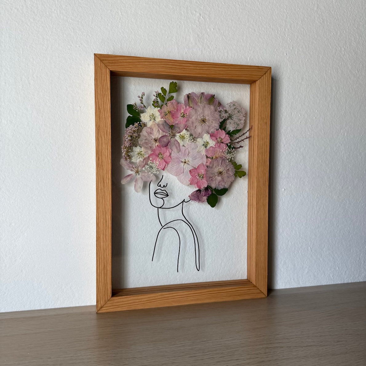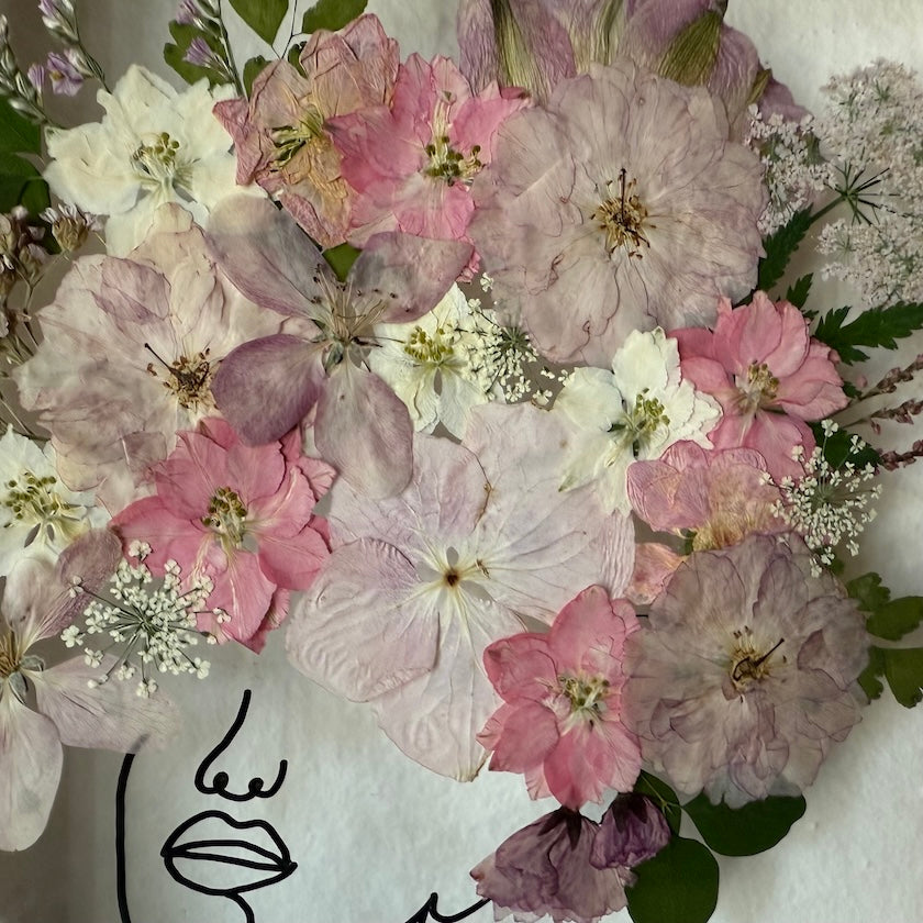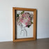 Květinový ručně vyrobený obraz s originální malovanou siluetou s květy v bílých a růžových barvách.
