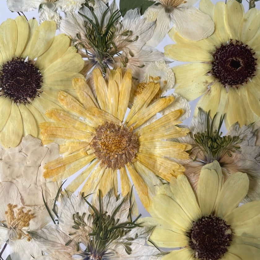 Květinový ručně vyrobený obraz s květy ve žlutých a bílých barvách, které rostou ze středu obrazu. Mezi květy najdete měsíčky, jasmín a mnoho dalšího.