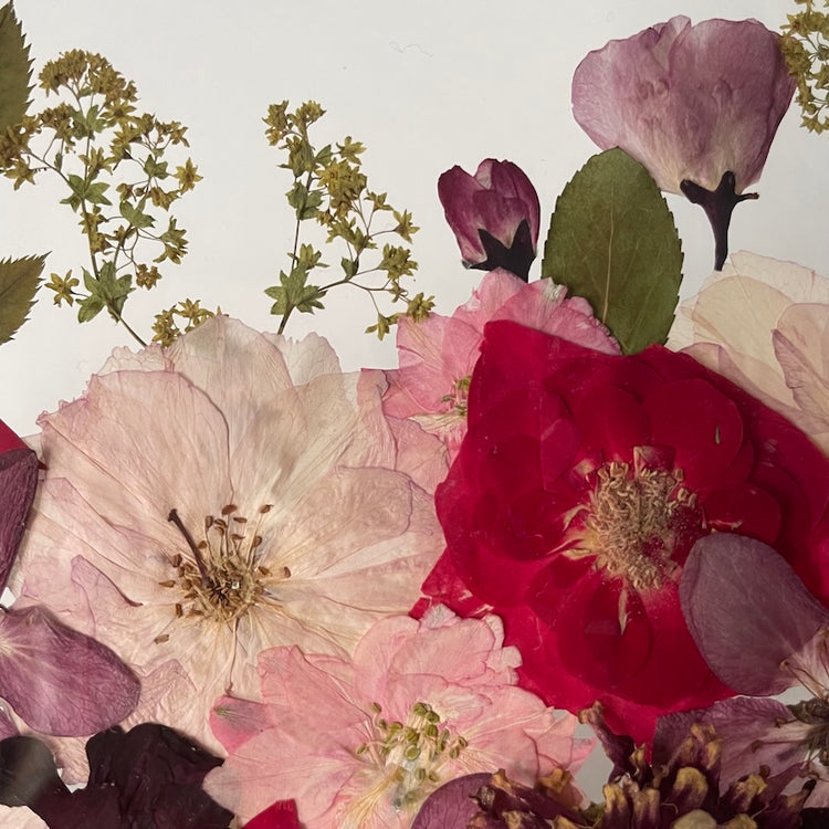 Květinový ručně vyrobený obraz s květy růžových a červených barviček, které rostou ze spodu obrazu. Mezi květy najdete růže, ostrožky, květy třešní a mnoho dalšího.