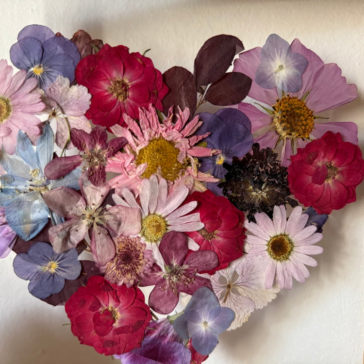 Květinový ručně vyrobený obraz s květy v červených, růžových a modrých barvách, které rostou ve tvaru srdce. Mezi květy najdete krásenky, růže, ostrožky a mnoho dalšího.