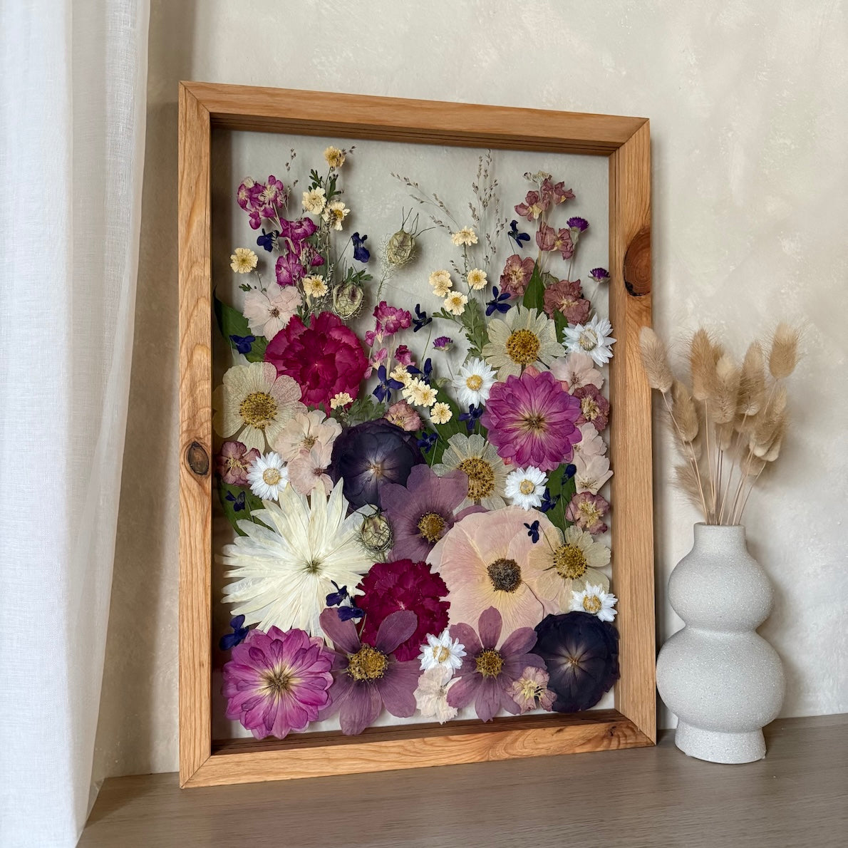 Květiny jsou zasazeny mezi skla a doplněny ručně vyráběným dřevěným rámem, který vzniká přímo v naší dílně. 🪵