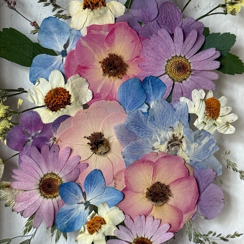 Použité květiny a rostliny jsou skutečné, ručně sbírané a šetrně lisované, aby si zachovaly svou přirozenou strukturu, jemnost i barevnost. 🌿 Následně jsou s citem aranžovány do jedinečné kompozice – každý obraz je originál, žádné dva kusy nejsou stejné.