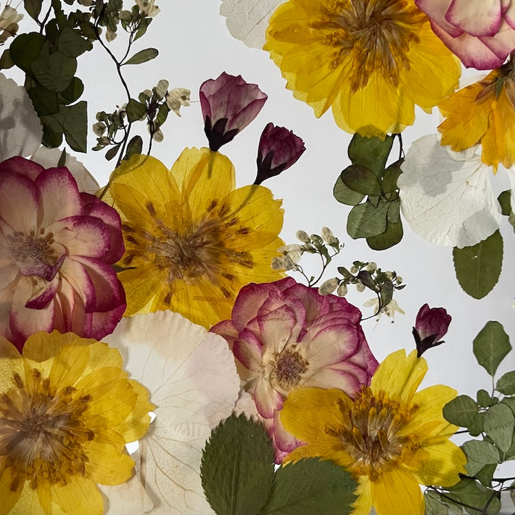 Květinový ručně vyrobený obraz s květy růžových, bílých a žlutých barviček, které rostou z rohů obrazu. Mezi květy najdete hortenzie, růže a mnoho dalšího.
