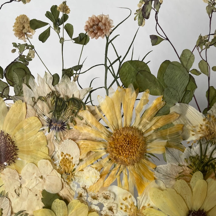 Květinový ručně vyrobený obraz s květy žlutých a bílých barviček, které rostou ze spodu obrazu. Mezi květy najdete černuchy, měsíčky, jasmín a mnoho dalšího.